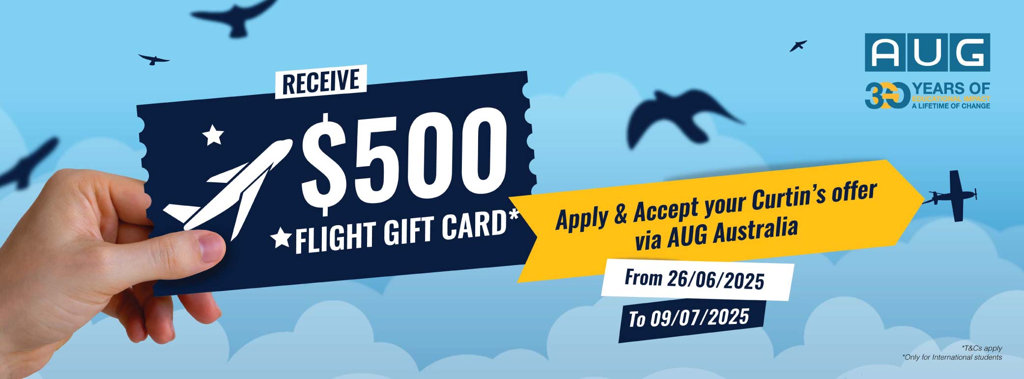 Planning to study at Curtin University in the July 2025 intake? Now’s the perfect time to secure your offer! Apply and accept your Curtin University offer via AUG between 26 June 2025 and 9 July 2025 and you’ll receive a A$500 Flight Gift Card** to help with your travel to Australia.