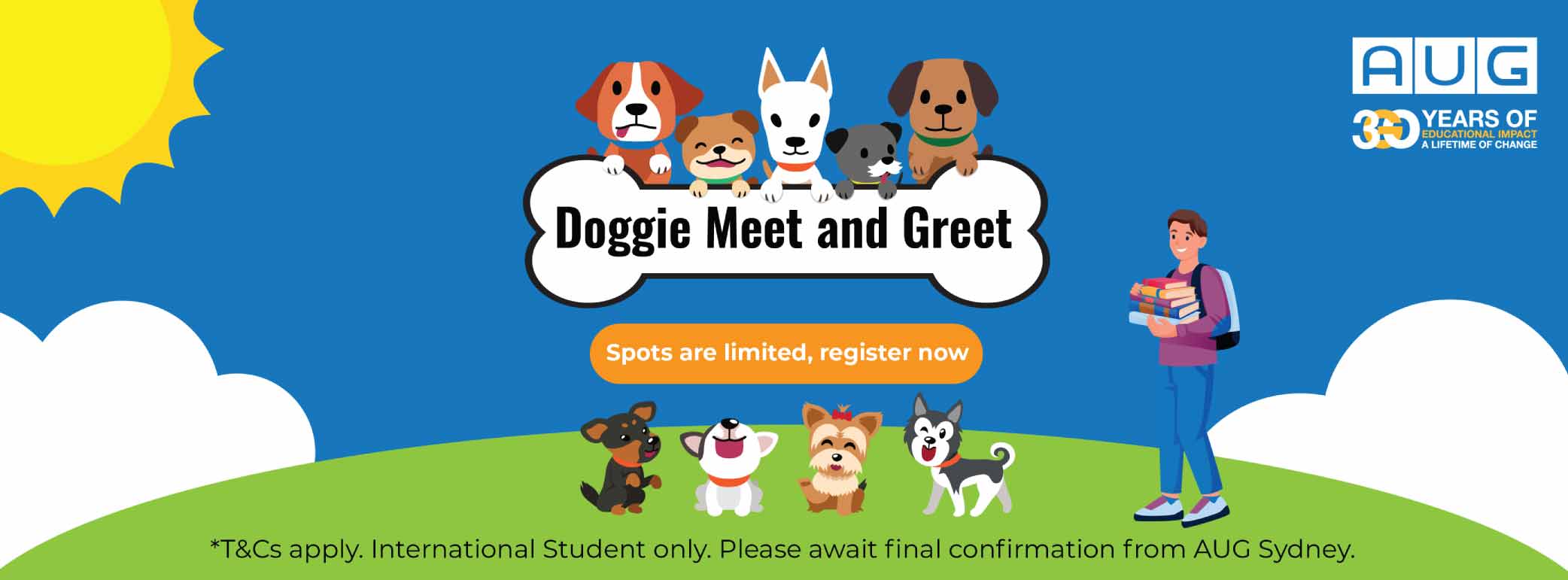 AUG Sydney prepares a special event featuring a friendly therapy dog! The adorable companion is here to help you de-stress and recharge as you embark on your academic journey.