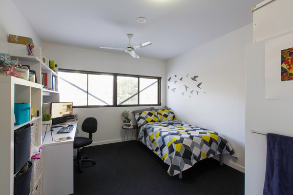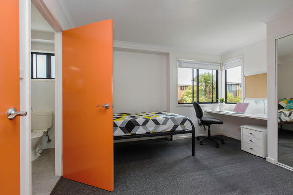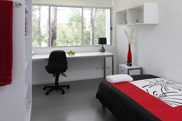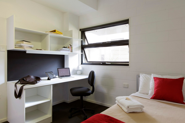 - Each bedroom furnished with king single bed, desk, chair, and wardrobe