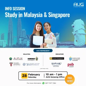 AUG Student Services akan mengadakan online event eksklusif: “Study in Singapore & Malaysia Info Session” pada:
