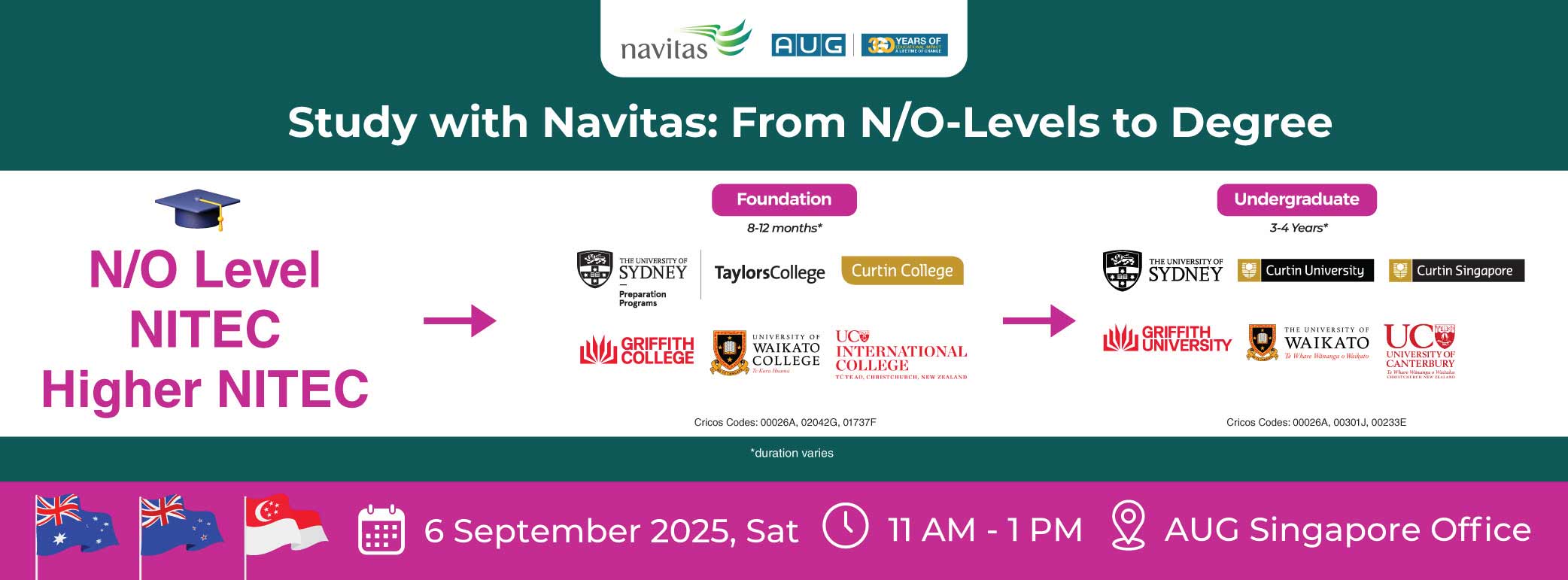 Looking to further your studies after N/O-Level, NITEC or Higher NITEC? Join us at the Navitas Open Day to explore direct pathways to top universities in Australia and New Zealand — no A-Levels or Polytechnic diploma needed!