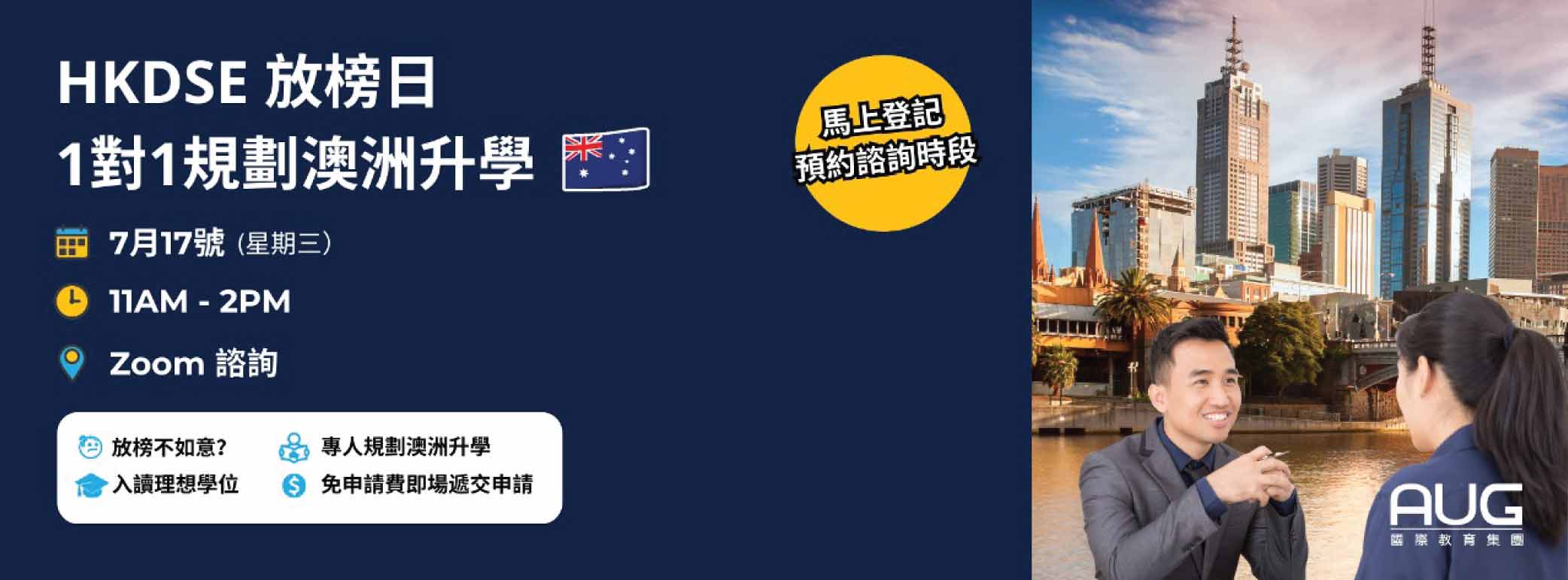 7月17號放榜當日,AUG專業升學顧問就您的DSE 成績規劃報名策略,即場收集文交申請,助您入理想澳洲大學及科目。