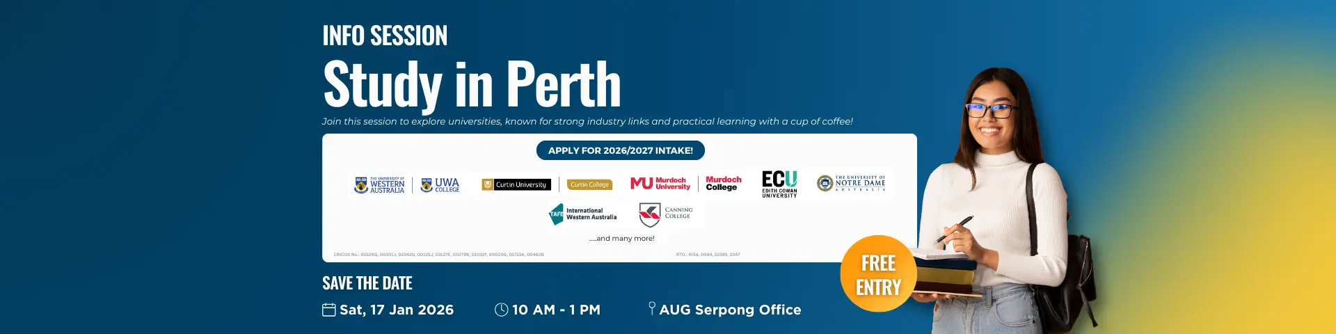 Jangan lewatkan berbagai sesi info dan pameran pendidikan dari AUG! Ini adalah kesempatan emas untuk bertemu langsung perwakilan universitas top dunia. Dapatkan info terbaru seputar beasiswa, syarat pendaftaran, dan konsultasi gratis dengan tim kami di kotamu.