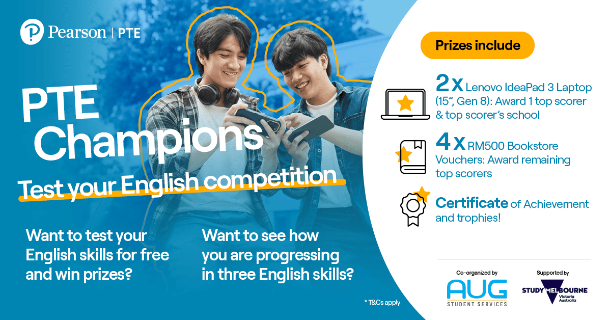 TERMS AND CONDITIONS: AUG Student Services (“AUG”) is organizing “PTE Champions: Test Your English” competition (“Competition”) in association with Pearson Malaysia Sdn. Bhd (“Pearson”). The Organiser may, at its sole and absolute discretion, amend these terms and conditions at any time without any prior notice to any party. This is a Malaysia nationwide competition.