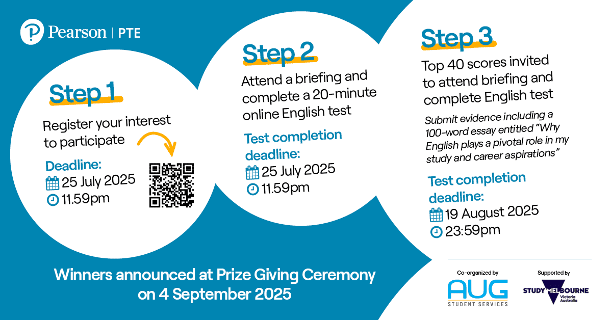 Pearson Test of English and AUG Student Services are proud to co-organise the #PTE Champions: Test Your English competition. This competition offers students the chance to test their English skills using AI-powered English tests—for free. There are 2 competition rounds. Winners get to win great prizes, comprising laptops and book vouchers.