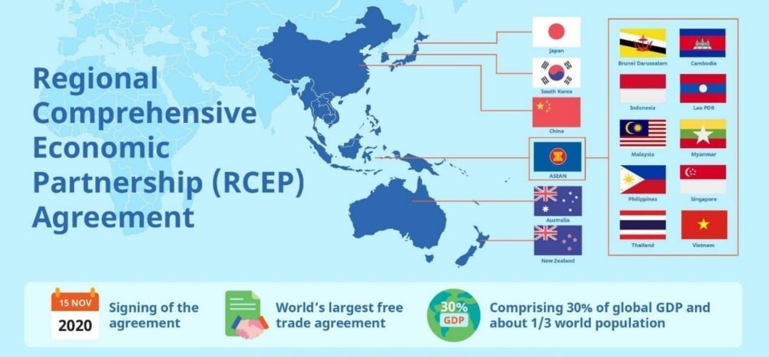 RCEP由东盟10国(文莱、柬埔寨、印尼、老挝、马来西亚、缅甸、菲律宾、新加坡、泰国、越南)、中国、韩国、日本、澳大利亚、新西兰组成,是全球最大的自由贸易区,覆盖全球约30%的国内生产总值(GDP),即$35万亿,覆盖全球约三分之一的人口。
