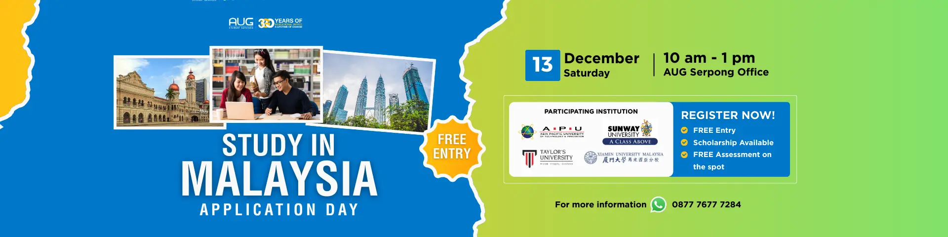 Jangan lewatkan berbagai sesi info dan pameran pendidikan dari AUG! Ini adalah kesempatan emas untuk bertemu langsung perwakilan universitas top dunia. Dapatkan info terbaru seputar beasiswa, syarat pendaftaran, dan konsultasi gratis dengan tim kami di kotamu.